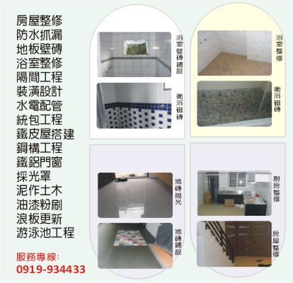 房屋修繕整修、泥作工程、裝潢設計、防水抓漏、統包工程、農舍起造、建地合作、鐵鋁門窗、鐵皮屋、防水、抓漏、鋁門窗、鐵門、鐵窗、鋁窗、鋁門、油漆工程、衛浴設計、營造包工、房屋增建、房屋修改、外牆拉皮、房屋修繕、房屋整修、室內裝修、壁磚施工、衛浴整修、砌磚隔間、鐵皮屋搭建、地板壁磚施工、裝潢拆除、水電配管、舊屋翻修、宅修、結構工程、土木工程、浴缸修改、地磚施工、建築營造、油漆粉刷、浪板更新、磁磚鋪設、水泥施工、採光罩、輕隔間、地板鋪設、游泳池工程、外牆拋光、浴室整修、浴室壁磚鋪設、廚房流理台訂製、舊屋翻新、老屋翻新、台北房屋修繕整修、台北泥作工程、台北裝潢設計、台北防水抓漏、台北統包工程、登記字號:H90725-000、土木包工業、G90201-000
